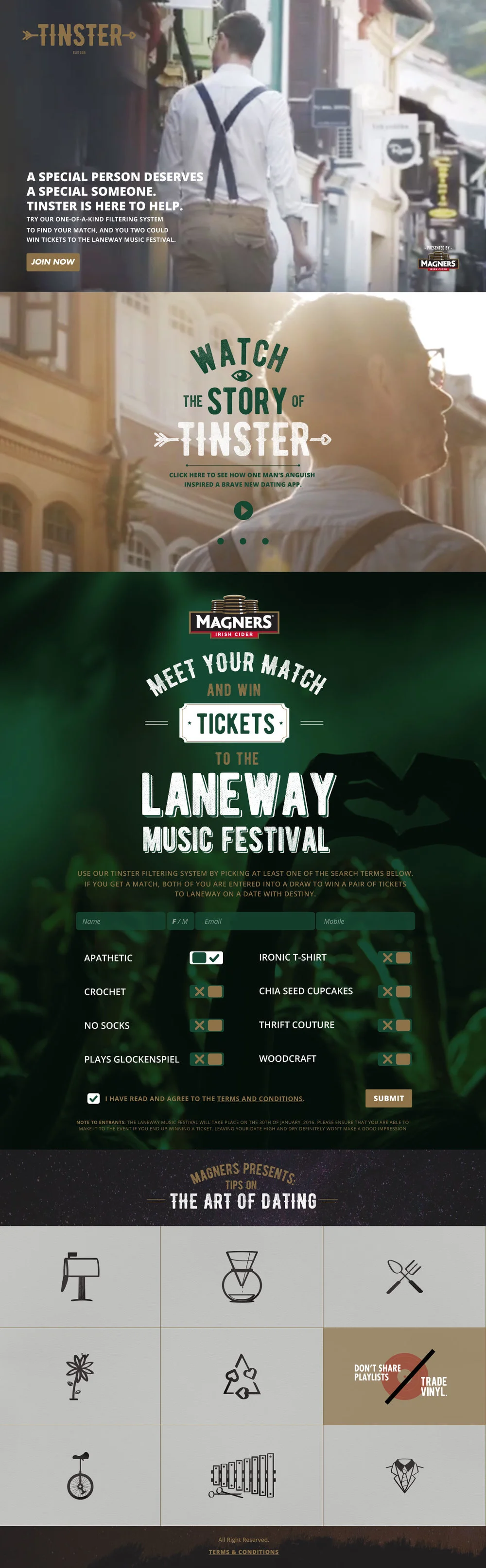 We created the Tinster video to look like a solemn yet moving 'kickstarter-like' video about the app, being purposefully melodramatic and ironic that calls for people to head down to the website www.tinster.co to join the "beta testing" of the app. All they need to do is be a fan of the Magners Asia Fan Page, select their interests and wait for their match!